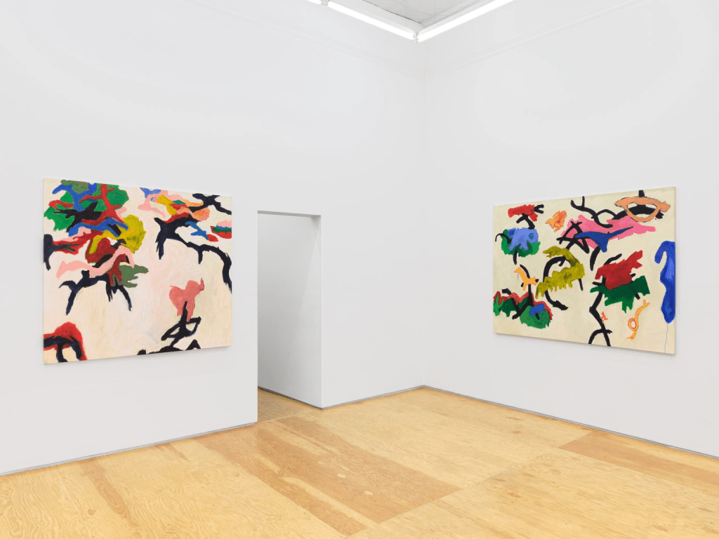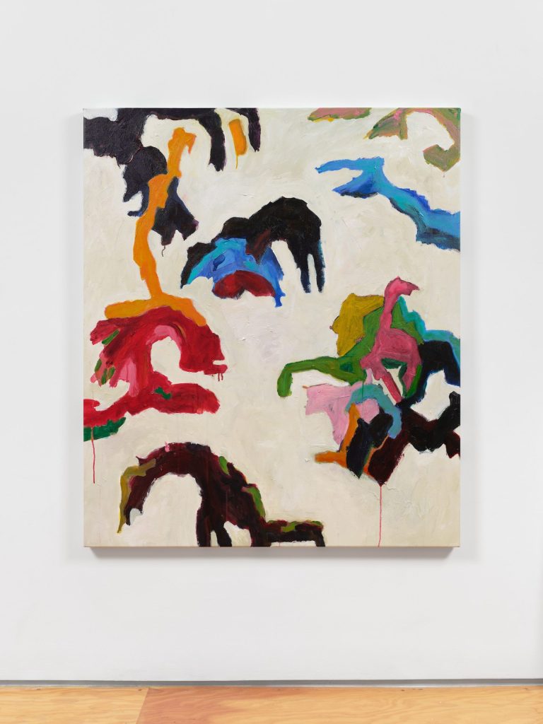 Dans des teintes très saturées de sarcelle, de vermillon et de marron sur des fonds beige terreux, Björk arrange des silhouettes d’animaux fluides comme s’il communiquait dans un ancien langage pétroglyphique tout en évoquant la topographie d’un canyon. Les personnages se battent, se reposent et aiment dans chaque tableau. La vie est animée et désordonnée ici. Les couleurs se mélangent et se défont. La peinture acrylique peut couler, même si, à un endroit, elle est appliquée de manière si épaisse qu’un agitateur en bois s’incruste dans la toile.